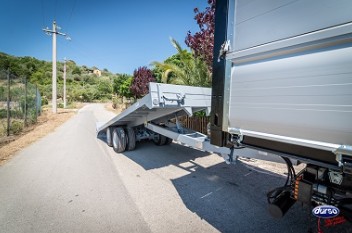 I rimorchi DRG 60 sono stati studiati per l’abbinamento con le Macchine Operatrici prodotte dalla DURSO Srl, la struttura a doppio asse ed a ruote gemellate consente, senza problemi ed in totale sicurezza, di macchine movimento terra e materiali di peso elevato. Il sistema di frenatura idraulica rende la marcia sicura in qualsiasi condizione. Completa il quadro l’omologazione come Macchina Operatrice Trainata che, in abbinamento ad una Macchina Operatrice Semovente, consente di condurre il treno completo con la PATENTE B.